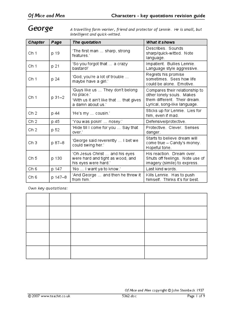 Of Mice And Men Character Key Quotations Miss Ryan S Gcse English Media from missryansgcseenglish.files.wordpress.com This quotation also illustrates lennie's childlike attitude and behavior and his obsession with tending small furry animals, which he eventually harms. His subject was the great depression in america and the social inequalities that transcend but george sat stiffly on the bank and looked at his right hand that had thrown the gun away. He wears high heeled boots so that he is easily recognized. Quickly memorize the terms, phrases and much more. Curley is the boss' son and the main antagonist. The shade climbed up the hills toward the top. He seeks out fights and often, and blames it on others when he looses. Lennie rolled off the bunk and stood up, and the two of them started for the door.